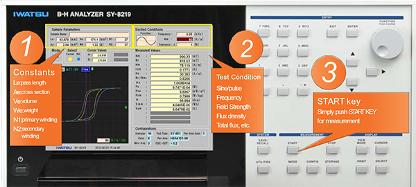 Tra le misure principali, la densità massima del flusso magnetico (Bm), densità residua (Br), intensità massima del campo magnetico (Hm), rapporto Br/Bm, ampiezza della permettività relativa (μa), Core Loss (Pc,Pcv,Pcm), corrente eccitazione del primario (I1m), tensione indotta sul secondario (V2m), Fase (θ), perdite totali del flusso magnetico (2φm), potenza apparente (VA).