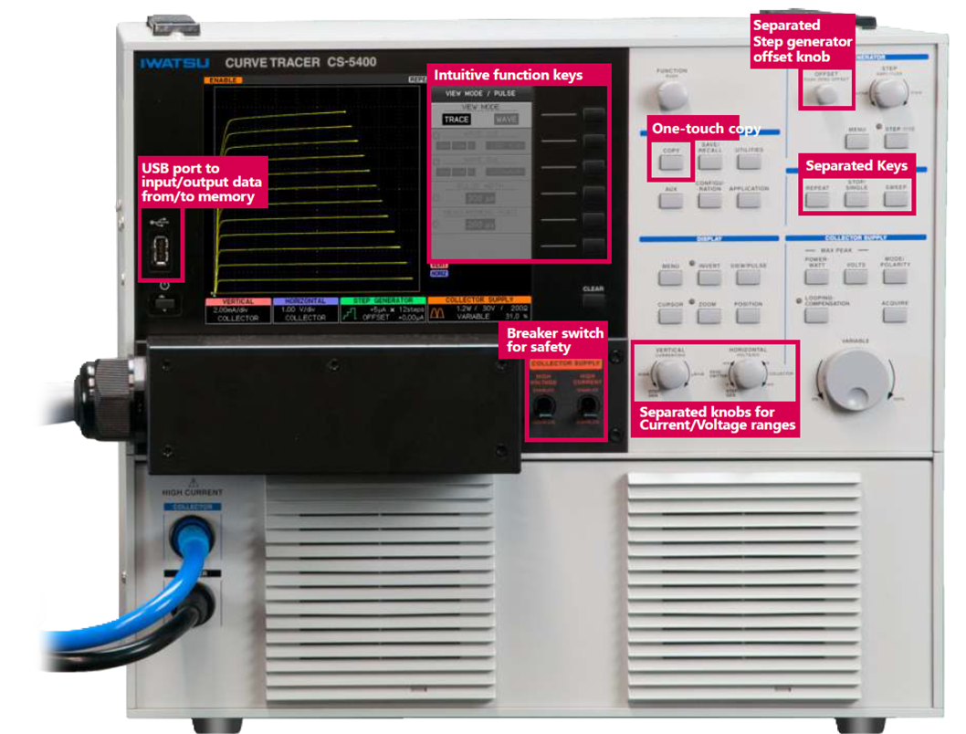 I curvetracer IWATSU continuano ad evolversi per soddisfare le esigenze dei clienti grazie ad una combinazione di funzionalità, specifiche all’avanguardia e usabilità. La serie CS-8000 è dotata di una sorgente ad alta tensione fino a 5 kV e una sorgente ad alta corrente fino a 2 kA. Presenta uscita a impulsi, modello di gate e risoluzione nella misurazione della corrente molto piccola; supporta quindi a pieno il design e la valutazione di semiconduttori a banda larga come SiC e GaN.