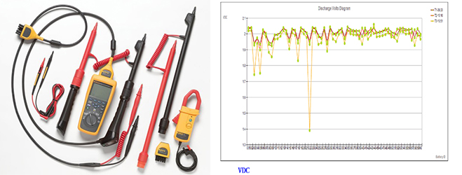 Con il BT521 è inoltre possibile misurare tensione in AC e DC e corrente nell’impianto, così come misurare la tensione delle batterie in fase di scarica delle stesse. In tale modalità è necessario mettere in erogazione funzionale la serie delle batterie e andare a misurare a intervalli regolari, su almeno 3 o 4 punti per la fase di scarica, la tensione DC di ogni elemento. È lecito aspettarsi una curva esponenzialmente decrescente ed è lecito aspettarsi che tutti gli elementi si comportino allo stesso modo e abbiano curve simili. Se invece si dovessero riscontrare linee di scarica piatte o decadimenti troppo rapidi si potrebbero dedurre funzionamenti anomali di quegli elementi.