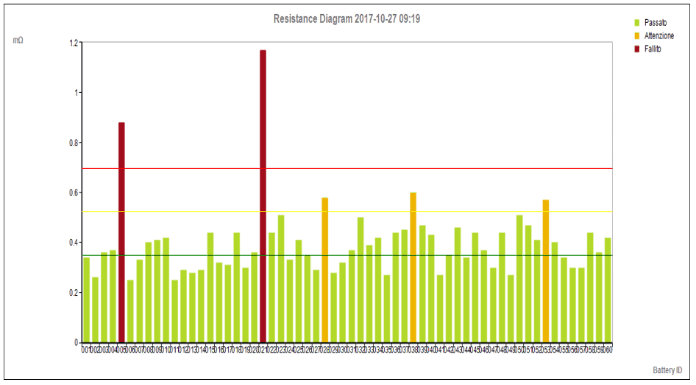 Solitamente l’aumento della resistenza interna dell’elemento è indice del peggioramento dello stato della batteria che, in caso di intervento, potrebbe non rispondere correttamente. È possibile perciò definire delle soglie di tensione e resistenza interna relative alle particolari batterie installate, sono entrambi dati che possono essere ricavati dalla scheda tecnica del fornitore delle batterie o empiricamente tramite una prima sessione di misure esplorativa, lo strumento infatti mostra sempre il valor medio di tutti gli elementi misurati nella sessione.