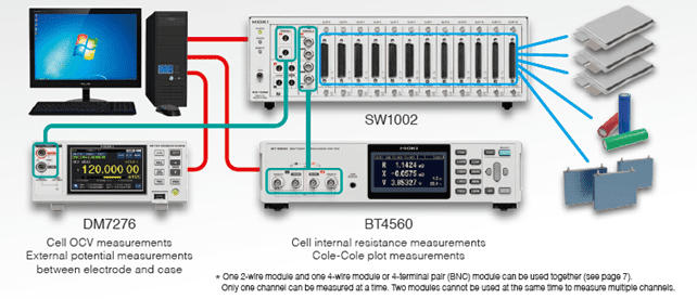 La variazione dell’OCV è molto piccola. Per questo motivo va impostata adeguatamente la lunghezza del test. BT4560 è teoricamente in grado di realizzare anche la misura della variazione di tensione a circuito aperto; tuttavia, è consigliato utilizzare un voltmetro che offre un’eccellente precisione dell’ordine di μV, in modo da poter rilevare minuscole variazioni di tensione. Per questo motivo, si introduce nel sistema di misura il DM7276, voltmentro di precisione. Nell’immagine a fianco è rappresentato un tipico setup di un sistema completo in grado di testare con lo switch mainframe SW1002 fino a 72 canali 72 4 terminal pair.