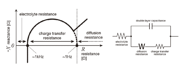 Le reazioni chimiche nelle batterie coinvolgono diversi processi e ciascun processo ha una propria velocità di reazione. Scansionando la frequenza e misurando l’impedenza è possibile valutare separatamente le caratteristiche di ciascuna parte. Questo consente di individuare i fattori di deterioramento della batteria. Il risultato della misura viene rappresentato in un grafico chiamato COLE-COLE PLOT o anche NYQUIST PLOT.