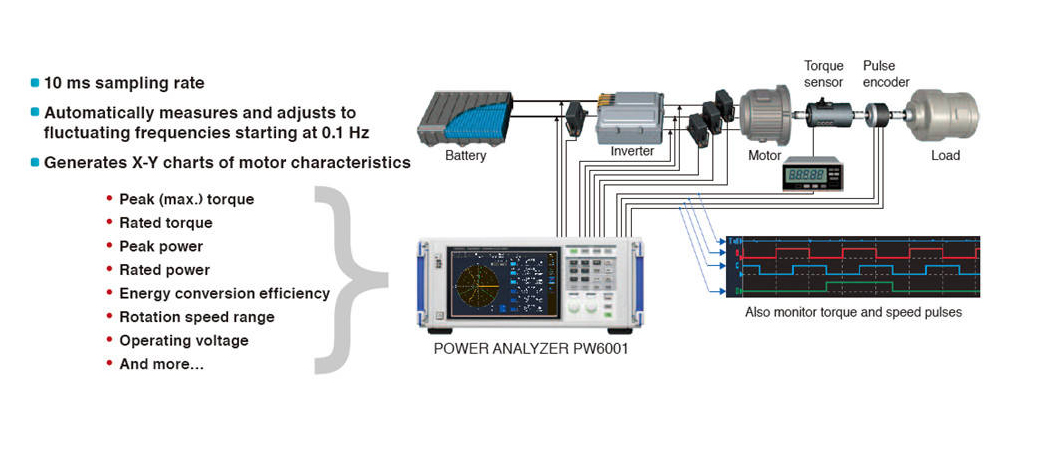 Con un Power Analyzer è possibile immettere i parametri del motore ed i segnali dai misuratori di coppia e dei misuratori di velocità per misurare la potenza del motore; è possibile valutare l’efficienza e la perdita di potenza in maniera estremamente accurata e veloce.