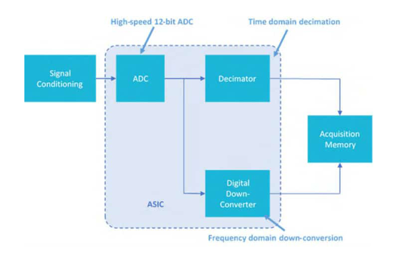 L’analisi in frequenza è un aspetto fondamentale per questa applicazione e la classica FFT ha molte limitazioni che sono state superate nell’oscilloscopio Tektronix MSO Serie5 grazie a Spectrum View: un hardware brevettato e incorporato nello strumento. Dietro ogni ingresso FlexChannel con ADC a12bit c’è un ASIC personalizzato e dedicato; ogni ADC invia dati digitalizzati ad alta velocità lungo due percorsi come indicato nella seguente immagine.