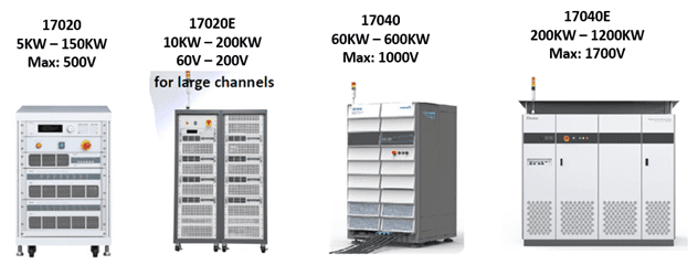 Chroma 1704017040E sono sistemi di carica e scarica rigenerativi in grado di fornire rispettivamente tensioni fino a 1000V e 1700V con potenze di 600KW e 1,2MW. Sono inoltre caratterizzati per fornire la certificazione di molti test standard internazionali quali ISO, IEC, UL, GB/T.