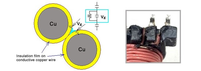 Il motivo è che la permeabilità dell’aria è molto inferiore a quella dell’isolante. Dalla ricerca e dalle curve di Paschen è provato che se la tensione del campo elettrico raggiunge un valore >350Vpk, a 1 atm di pressione, per piccole distanze (7-10um) avviene l’innesco della scarica parziale. Analogamente per le parti a contatto esterne. Con il proseguimento delle scariche parziali (PD) la carbonizzazione graduale porta al cortocircuito (fare riferimento alla Figura 2). Oppure, ancora prima che il trasformatore venga distrutto, è probabile che la PD provochi interferenze anomale causando il malfunzionamento del circuito digitale.
