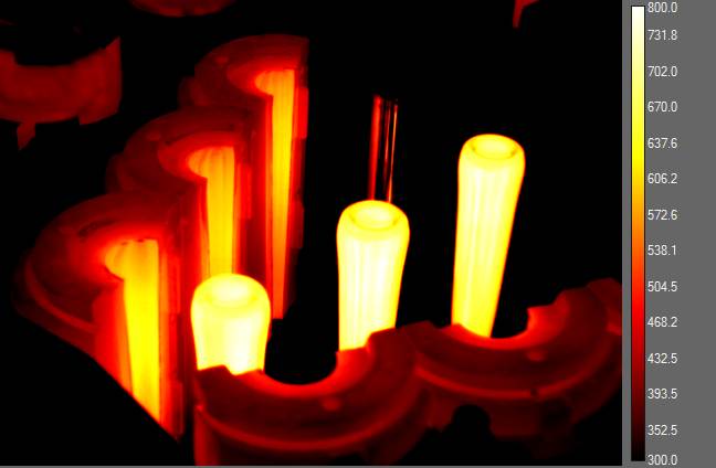 Figura 3 Industria del vetro – Sono visibili le sagome delle future bottiglie all’apertura degli stampi– Termocamera brandeggiabile con video radiometrico a bordo (30 Hz)