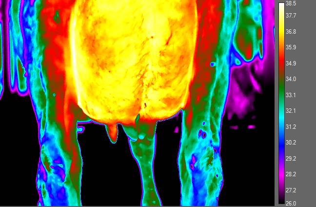Figura 5 Mastite (vacca in cura da 2 gg) –E’ ancora visibile la temperatura sensibilmente maggiore del capezzolo del quarto anteriore sinistro rispetto ai rimanenti – Termocamera brandeggiabile con risoluzione del sensore pari a 640×480 pixel
