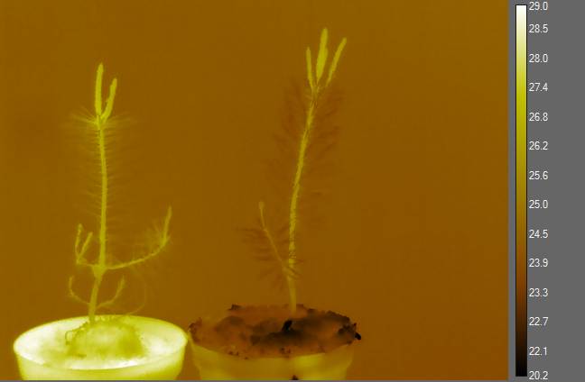 Figura 4 Stress idrico – Picea alba, Abete bianco – E’ visibile la differenza di temperatura delle parti verdi tra le due plantule di abete – Termocamera brandeggiabile con sensibilità termica pari a 0,045°C