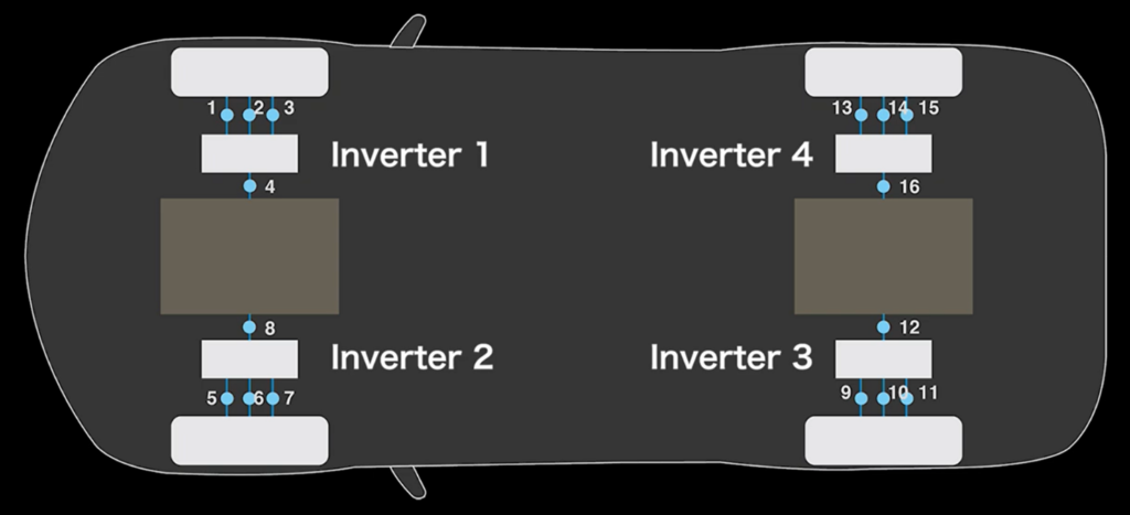 Nell’immagine a lato un esempio di automobile elettrica con 4 motori, uno su ogni ruota. E’ frequente la soluzione con 1 motore per asse, che implica comunque la necessità di avere 8 canali.