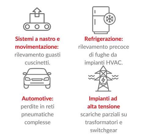 • Classificazione automatica delle sorgenti sonore (perdita, guasto, scarica parziale)