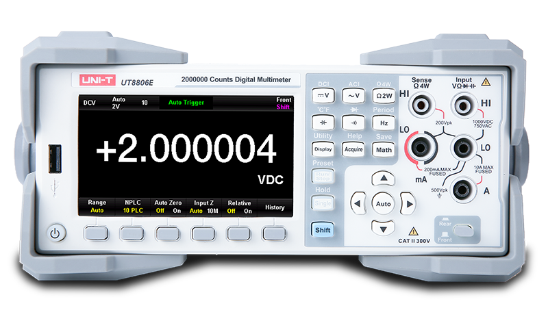 UT8806E è un multimetro digitale da tavolo a 6½ cifre con un display massimo di 2.000.000. È caratterizzato da alta precisione, multifunzionalità e automazione completa. UT8806E è dotato di un display TFT da 4,3 pollici con una risoluzione di 480*272, supporta operazioni LAN, USB, RS-232C e GPIB (opzionale) ed è adatto per misurazioni ad alta precisione in laboratori e sistemi di test automatizzati.