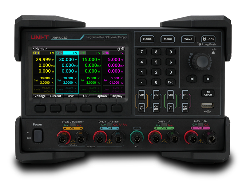 L’alimentatore lineare programmabile in CC UDP4303S è dotato di due uscite da 32V/3A, un’uscita da 15V/3A e un’uscita da 6V/10A. Offre una regolazione del carico estremamente bassa e un’uscita a basso rumore di ripple, con ciascun canale isolato dagli altri. Tutti e quattro i canali supportano la funzione di rilevamento remoto (4 fili).